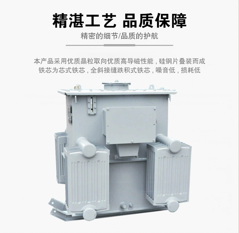 型接成693V或”D”型接成400V供電,在電纜接線盒內(nèi)直接裝次級端頭引出六個瓷套供用戶改接變壓器吊裝利用焊在箱壁的吊攀,變壓器箱底均裝有拖撬,在拖撬上備有安裝孔,可供礦并需要時加裝礦車滾輪。